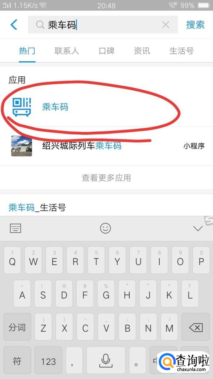 输入“乘车码”点击搜索,点击应用“乘车码”,如下图所示。