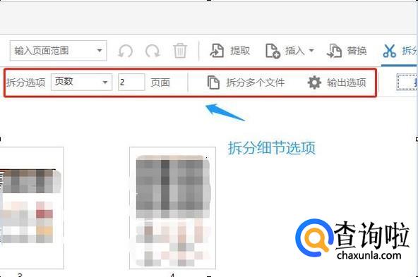 然后缩列图的右上角有一把名为“拆分”的小剪刀图标,点击以后下方会弹出详细的拆分选项,比如说我们打算拆分为几页、拆分当前页还是所有文件等;