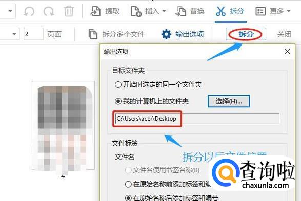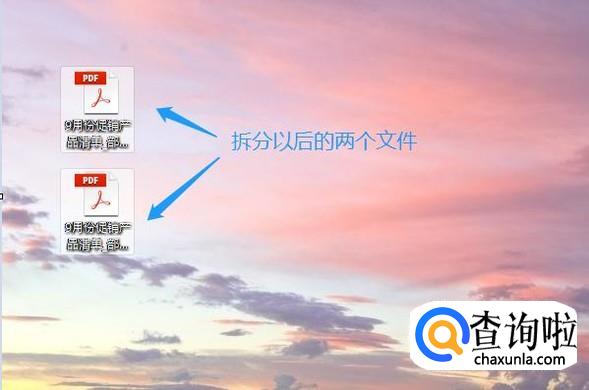 具体的拆分细节,大家完全可以根据自身需要来设定,假如小编以拆分当前页、拆分到电脑桌面为例,如图设置好以后点击“拆分”,返回到电脑桌面就看到刚才的单个文件被拆分为两个了;