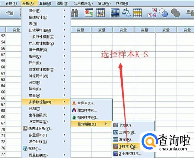 接下来点击顶部的分析菜单,选择非参数校验下面的样本K-S选项,如下图所示