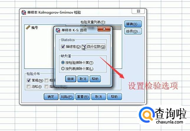 然后点击右侧的选项按钮,在弹出的界面中勾选描述性和四分位数复选框,如下图所示