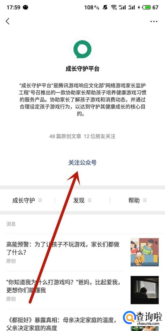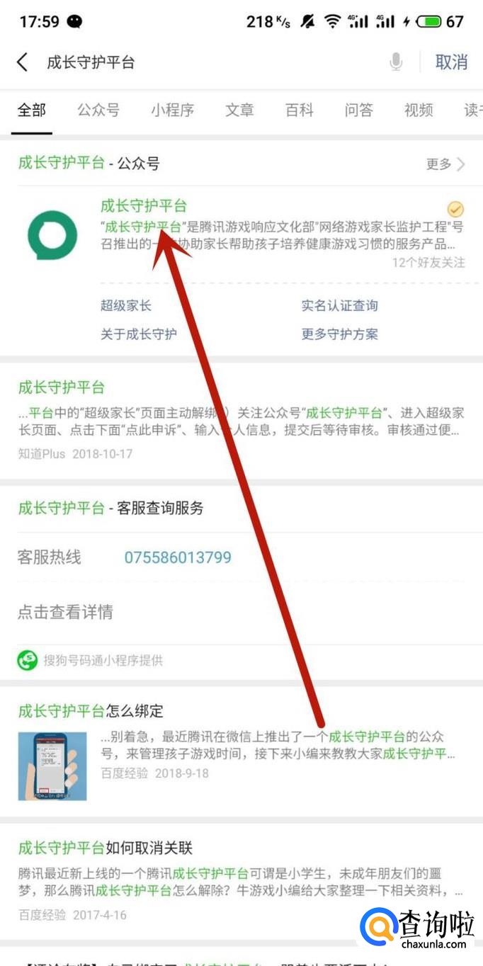 在微信发现页搜索栏中搜索“成长守护平台”,点击并进入公众号,如图所示。