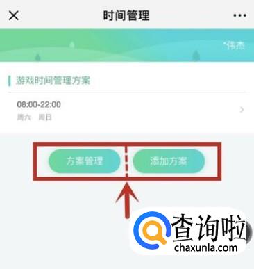 点击超级家长→时间管理→添加方案→设置完成。备注:如您只设置周六-周日可登录时段,其他未设置的时段,是无法登录游戏的哦