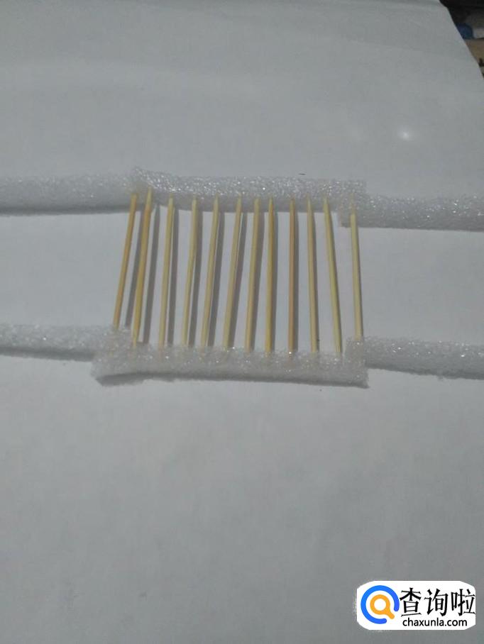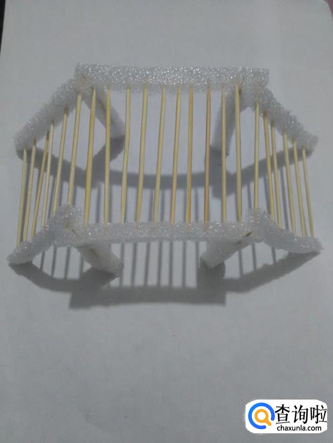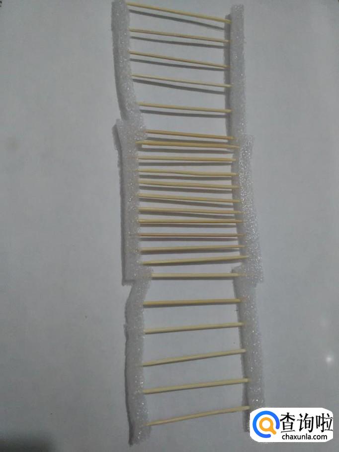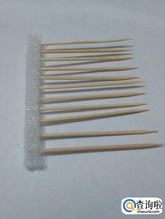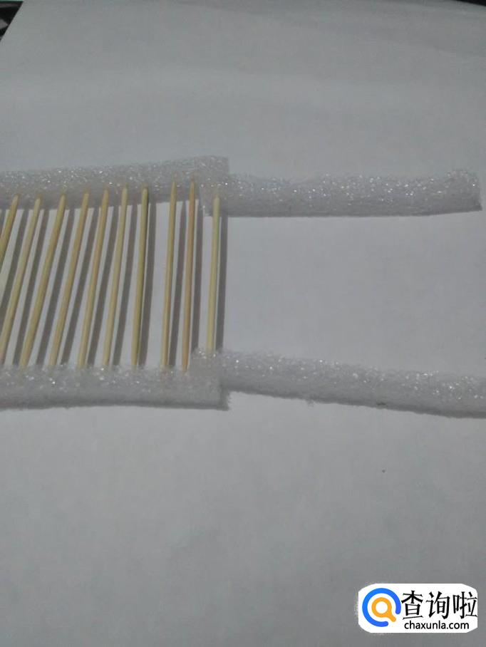 将牙签的一端扎进一根泡沫的一侧,整齐排好。