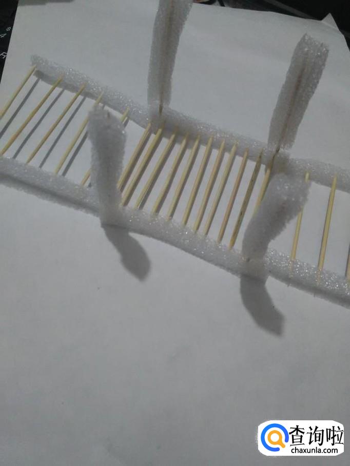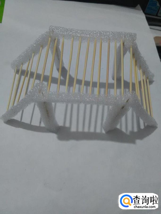 再将牙签的另一端扎进另一根泡沫的一侧,桥面就做好了。