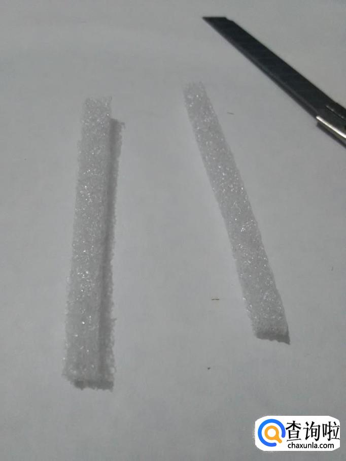 先用裁纸刀从泡沫塑料上面裁下两个和牙签差不多长的长方体小条。