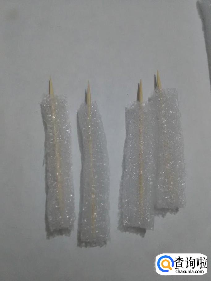 将四根牙签分别穿进四根泡沫的中间,牙签的一端从泡沫的一端露出头来。
