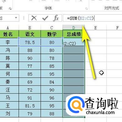 =B2+C2也可以替换为=SUM(B2:C2);同样是可以计算出总成绩。