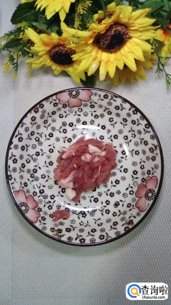 准备适量五花肉,将五花肉切成肉丝,再准备适量葱姜蒜,切碎后放在五花肉里。