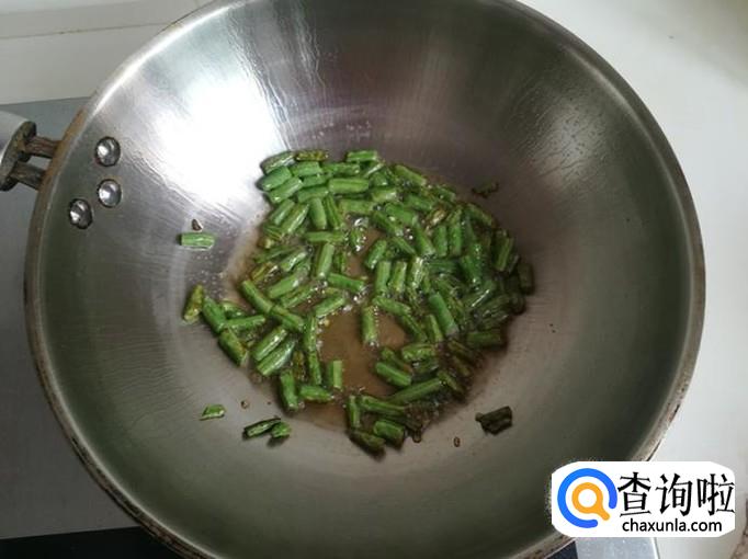 炒锅放多点花生油,等油温达四成热时,把豆角下入油锅,调中火炸至豆角发软,捞出沥油。