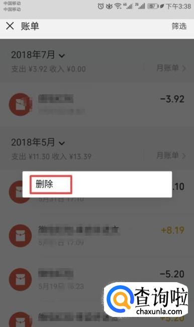 弹出的界面,我们就可以点击删除了,由于微信零钱明细无法一次性删除,只能这样一个个删除,还是比较费事的,但也只能这么删除零钱明细了。
