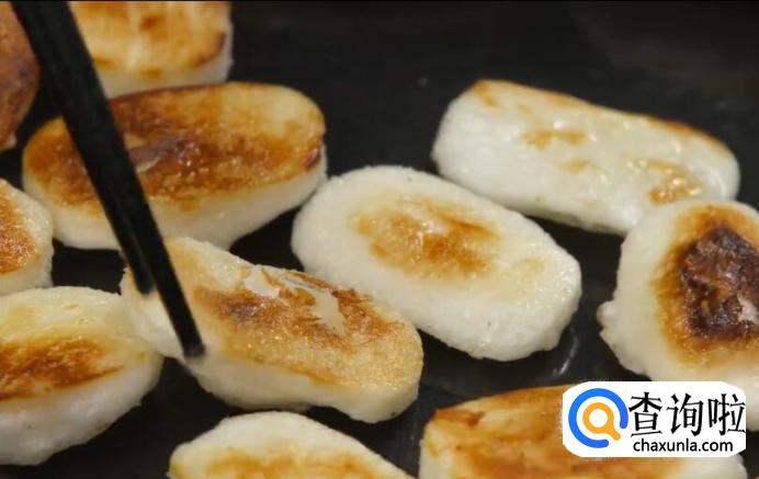 热锅起油,将年糕煎至两面金黄,有点焦焦的感觉最香,盛出。