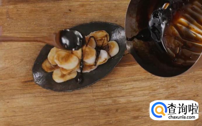 煎好的年糕趁热淋上红糖浆。