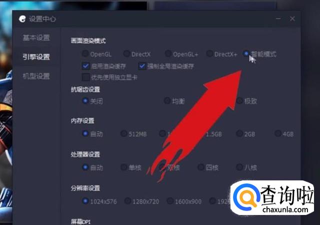 进入设置中心以后点击引擎设置,在右侧选择智能模式选项,如下图所示