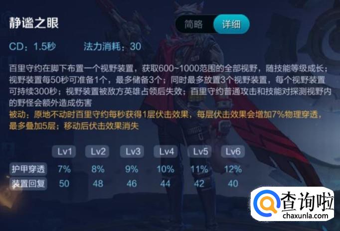 首先我们来介绍百里守约的技能。一技能,静谧之眼,在百里守约脚下布置一个视野装置,最多能安装三个,放在草丛不易被发现,如果地方英雄发现,占领后失效。