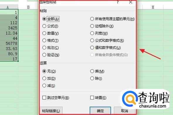 然后会弹出选择性粘贴对话框,我们点击运算下面的“乘”,其他的无需做任何更改;