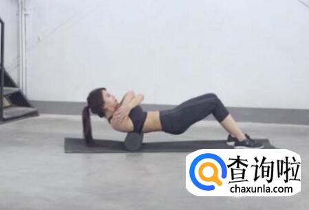 1.仰卧姿抱胸双腿屈膝,将泡沫轴放在中背部下方,腹部收紧;