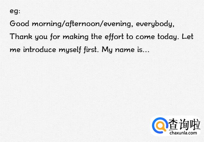 英语经典开场白之一:问候全场,介绍自己。这是一种普遍又不失礼的一种方法,首先对全场致以最深切诚挚的问候,再让所有听众知晓自己。就算你的演讲不那么出色,听众至少知道你是谁。