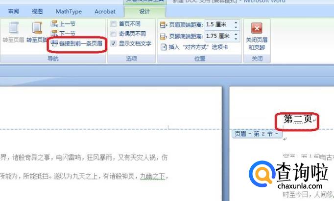 双击第二页页眉,进入编辑状态,如图所示,点击工具栏“链接到前一页页眉”(没有点击之前该按钮有黄色底纹,点击之后底纹消失)。此时把第二页页眉改成“第二页”。