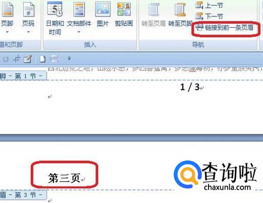 同理,重复步骤3和4,在第二页最后插入“分节符(连续)”,点击“链接到前一页页眉”,就可以把第三页页眉改动,如图所示。