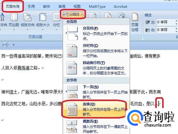 再来设置页眉不同。光标移到第一页最后,点击“页面布局”,选择“分隔符”“分节符(连续)”。