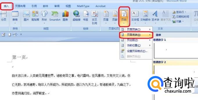 我们先设置页脚不同,我们只需插入页码就行了。点击“插入”,然后选择“页码”,“页面底端”,然后选择一种页码格式就行。