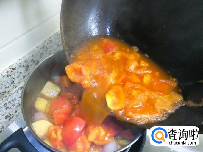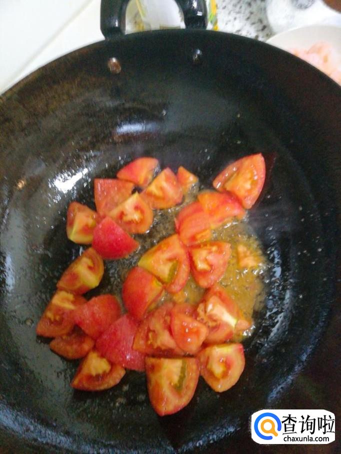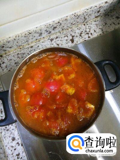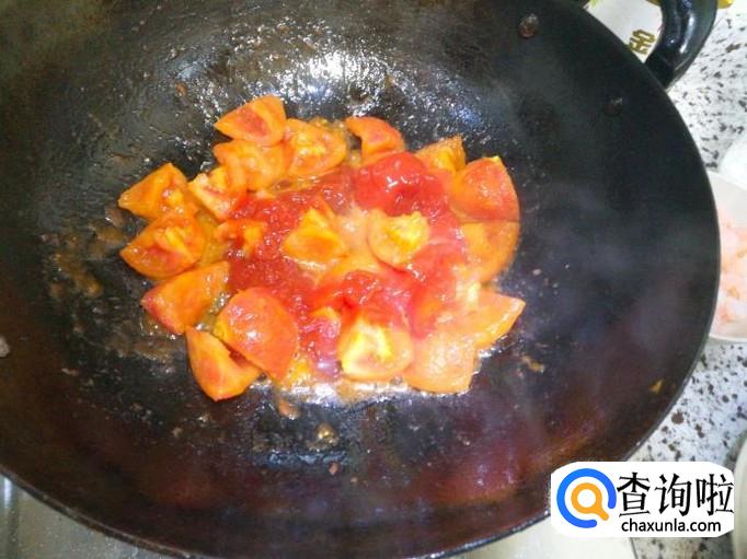 加入适量的番茄酱,增加番茄的味道。当番茄酱和番茄融为一体时,倒入适量的清水,并煮开。