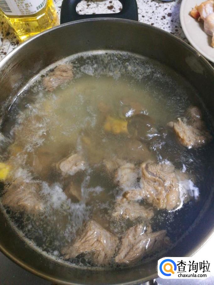 在锅里放入几块生姜,并倒入适量清水烧开,在将解冻后的牛腩肉,放入锅中打水焯,以便将牛腩肉中的血水逼出来。