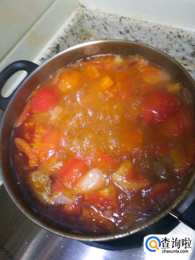 将番茄汁倒入装有牛肉和蔬菜的汤锅中,并加入适当的胡椒粉、盐、糖。