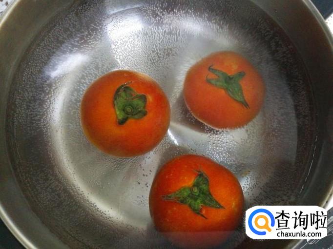 将西红柿放在热水里煮一会儿,等待西红柿皮开始脱落后,将皮轻轻撕下,并将西红柿切成块状。