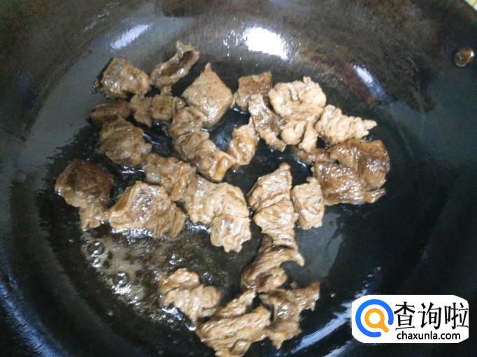 另起一锅,待锅热烫后,在锅底放入适量黄油,待其融化一部分后,将焯好的牛肉倒入锅中翻炒。翻炒完毕后,放入汤锅中。
