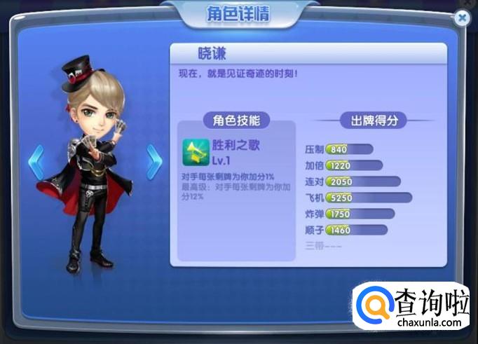 晓谦,玩家使用最多的角色。技能是在竞技模式得分加成,根据对手剩下的牌来为自己加分