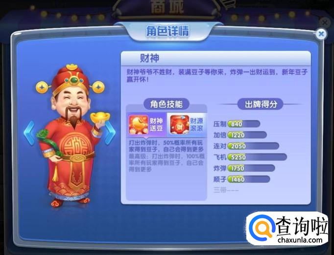 财神,当使用财神打出炸弹时会获得欢乐豆,出牌会获得更多得分,而且购买钻石的时候会额外获得更多钻石,土豪必备