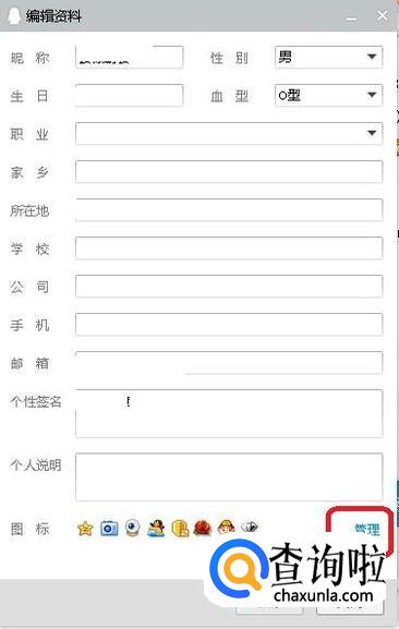 如图所示,进入编辑资料面板,我们点击右下角的“管理”。