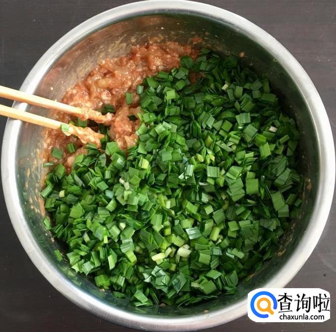 把切好的韭菜末放入腌制肉馅的容器中再次搅拌均匀即可