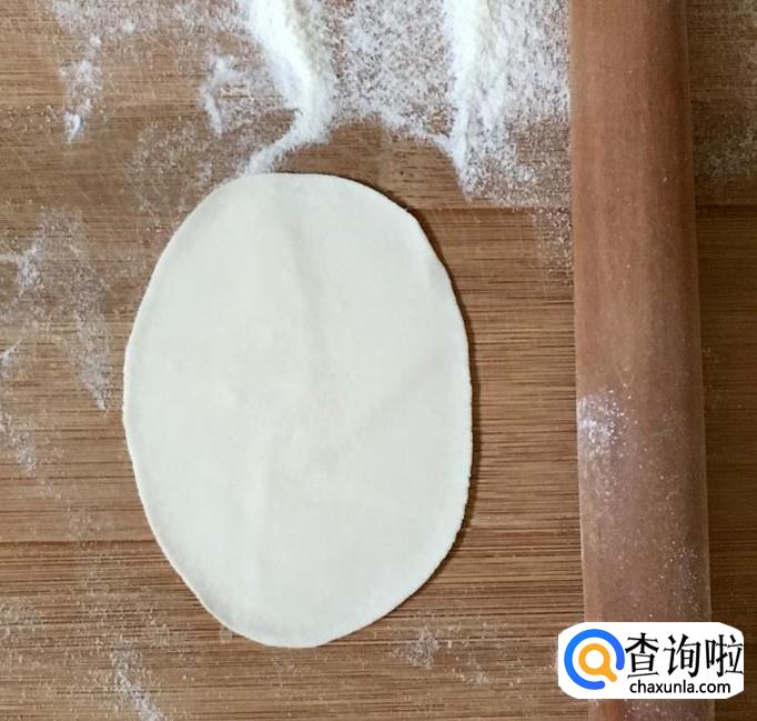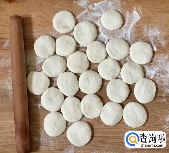 案板铺撒干面粉取一小块醒好的面团搓成长条,揪成小面剂子搓圆按扁后擀成饺子皮