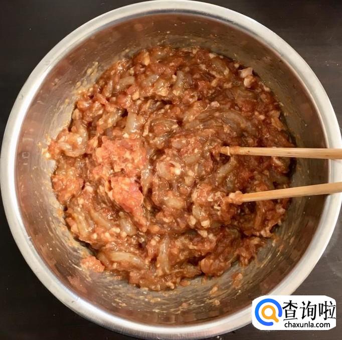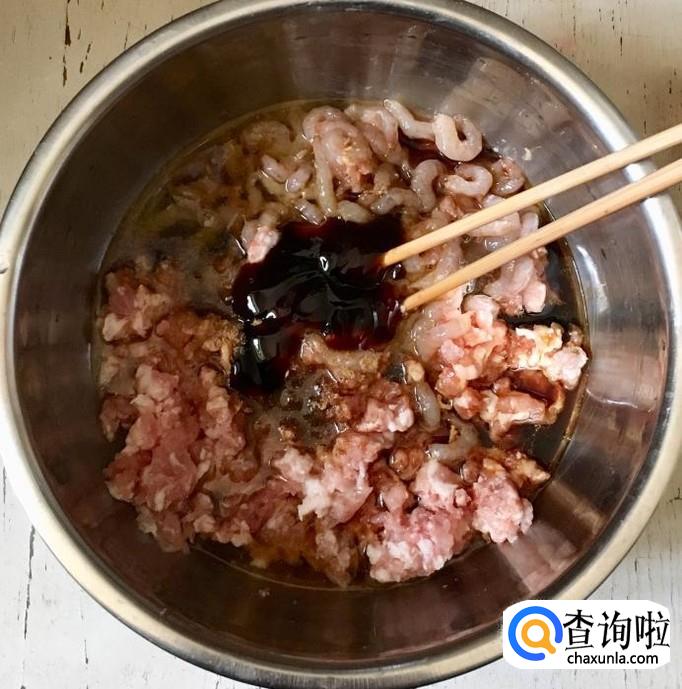 肥瘦相间的猪肉一块剁成肉泥,鲜虾清洗干净后剥去外皮。把肉泥和虾仁放入一个容器中,加入适量的的花生油、香油、料酒、生抽、盐搅拌均匀