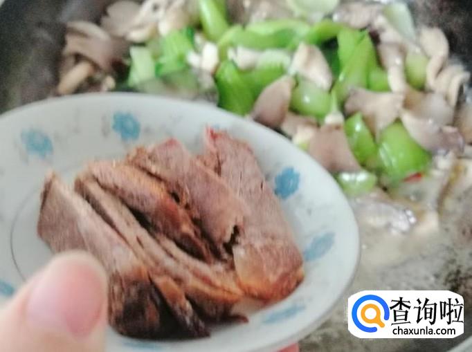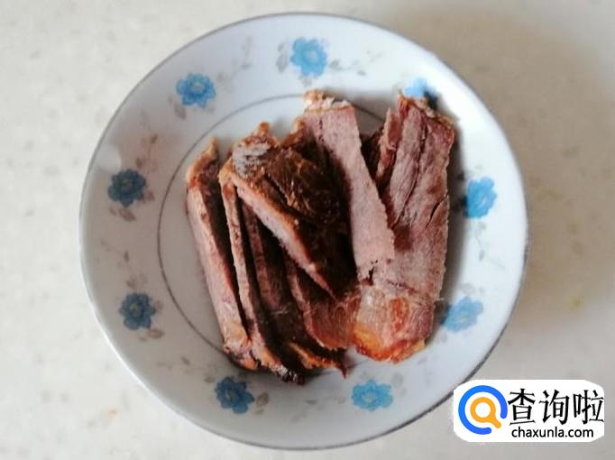 准备适量牛肉,用刀把牛肉切片待用,我这里选用的是熟牛肉,在炒菜过程中加入就可以了。