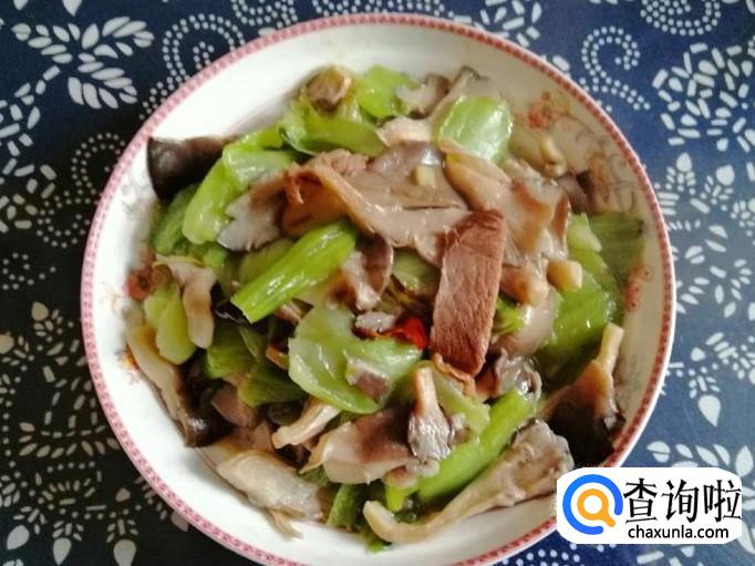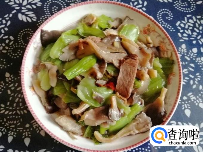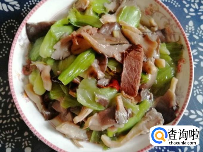 如图所示,蘑菇油菜杆炒牛肉就做好了,色香味俱全。关火加入适量生抽和食盐,翻炒均匀,把炒好的蘑菇油菜杆炒肉,盛入盘中就可以开吃了。