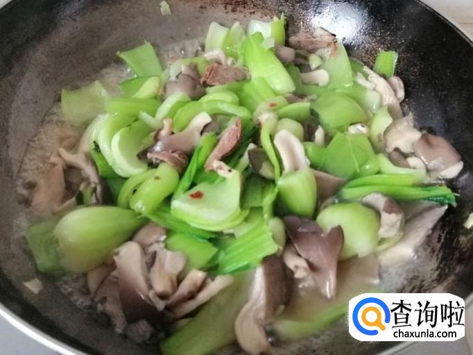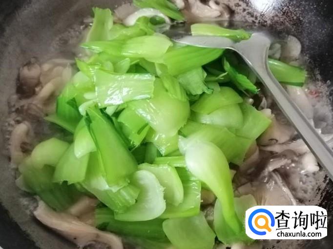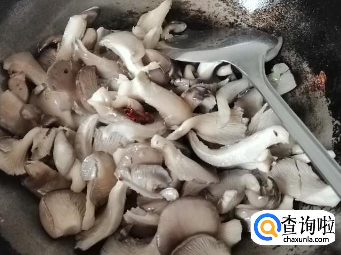 炒锅放油,油热后放入备好的葱、姜、辣椒炝锅,炒出香味后加入洗好的蘑菇,用铲子把蘑菇翻炒均匀,稍炒片刻后加入油菜杆。