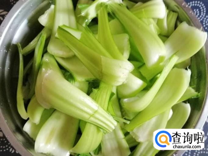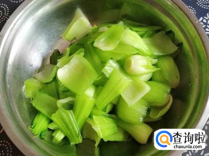 取适量新鲜的油菜,用清水把油菜洗净,然后把油菜叶和杆部分分开,杆我们用来炒肉,叶可以做汤,把油菜杆折成段待用。