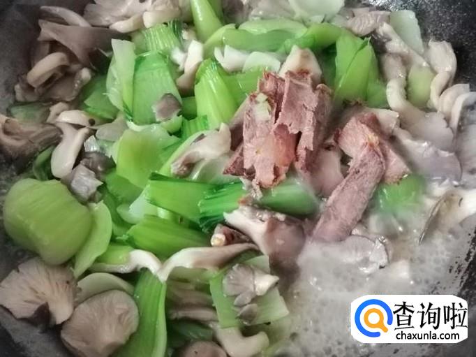 用铲子继续翻炒均匀,随后可以加入切好的熟牛肉片,用铲子翻炒均匀,蘑菇比较容易出水,炒菜过程中就不要加水了。