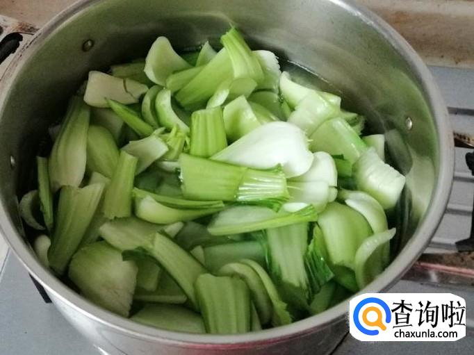 煮锅烧水,水开后放入洗好的油菜杆,用筷子搅拌油菜,让其充分入水,烫两三分钟就可以捞出备用。
