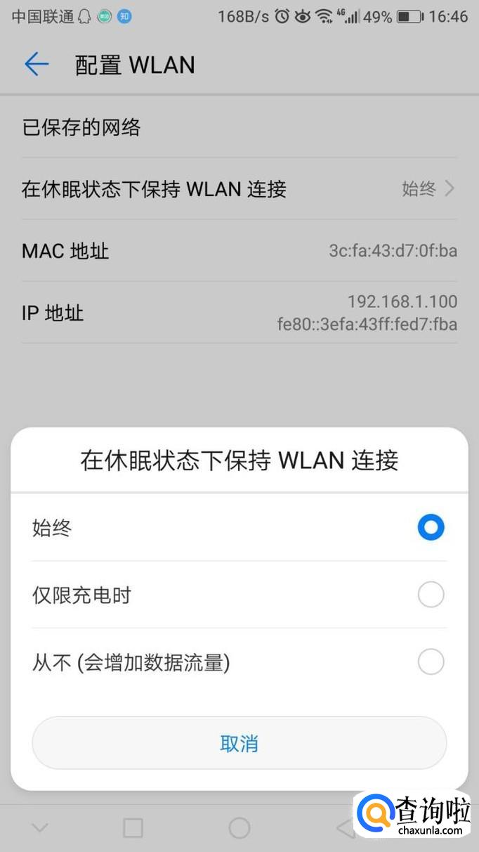 点开wlan配置:在休眠状态下选择始终链接wifi