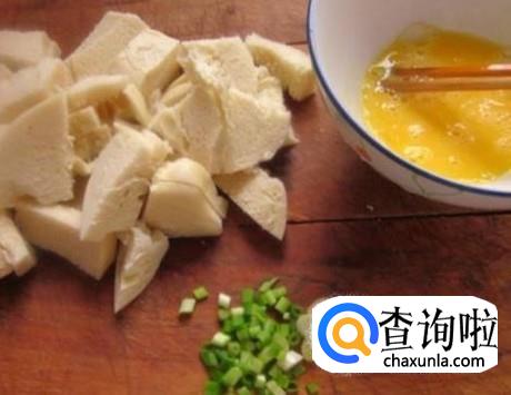 将凉馒头切成丁,将鸡蛋打入碗中,将葱切成小段。
