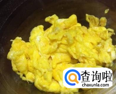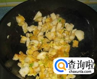 锅中放入适量的油,先将蛋液放入锅中,用铲子搅成小块,盛出待用。