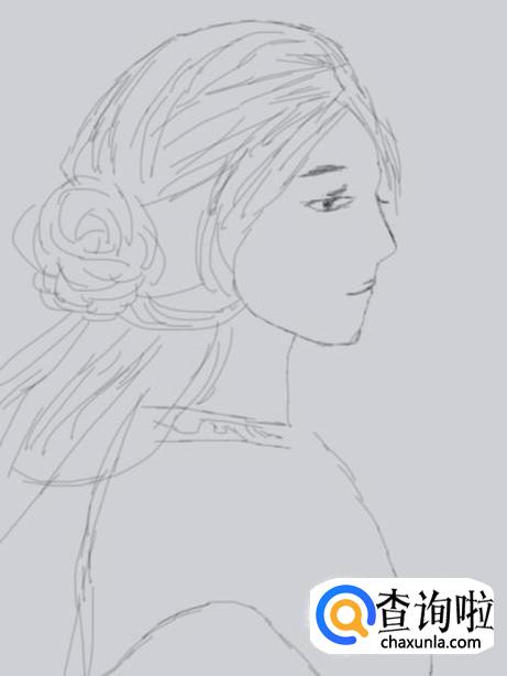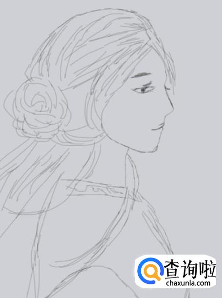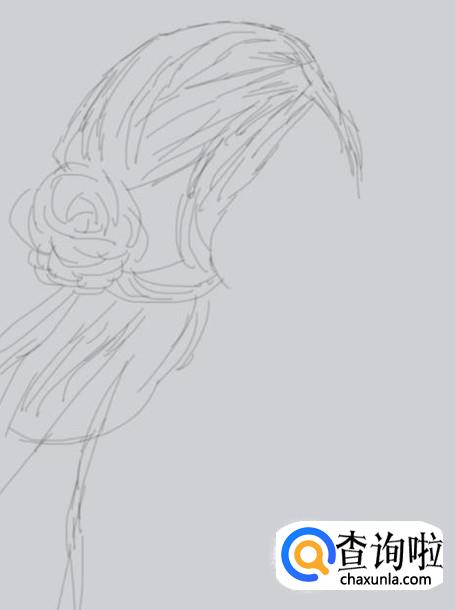 首先我们画出古装人物的头发造型,然后在头发上画出一束扎起来的发束,如图所示: