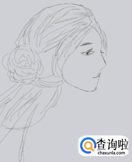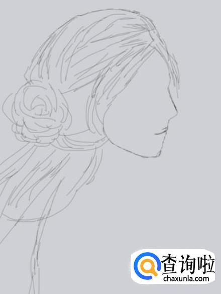 在头发的基础上画出人物的侧脸,并在脸上画出人物的鼻子和嘴巴,如图所示: