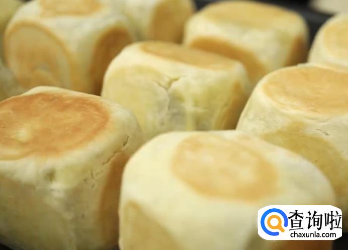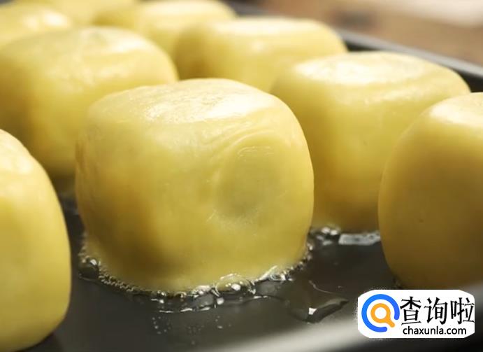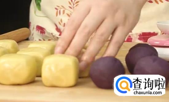 之后将静置好的面团取出,分成27克每个,再取一个擀扁放紫薯芝士酱。