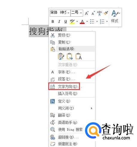选择输入的文字,然后单击鼠标右键,在右键菜单哪里找到文字方向选项,如图所示: